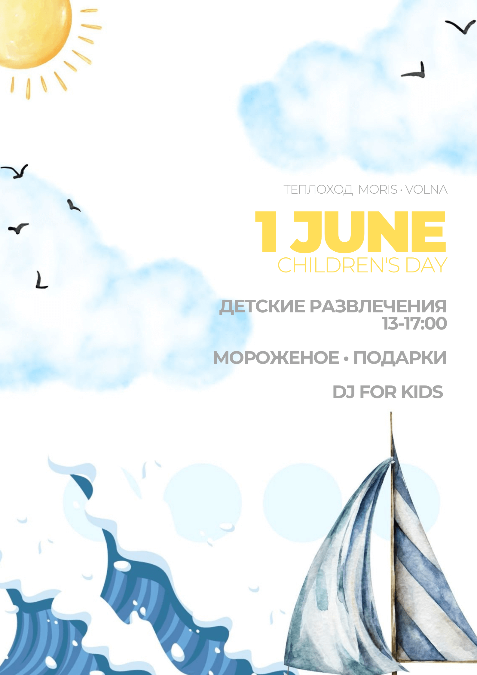 1 июня, в честь Дня защиты детей, на теплоходах «Морис» и «Волна» пройдет праздничная детская программа. Маленьких гостей ожидает увлекательная игра с приглашенными Микки Маус и Минни Маус, аквагрим, вкусное угощение в виде мороженого, а также подарок – фирменный набор карандашей.